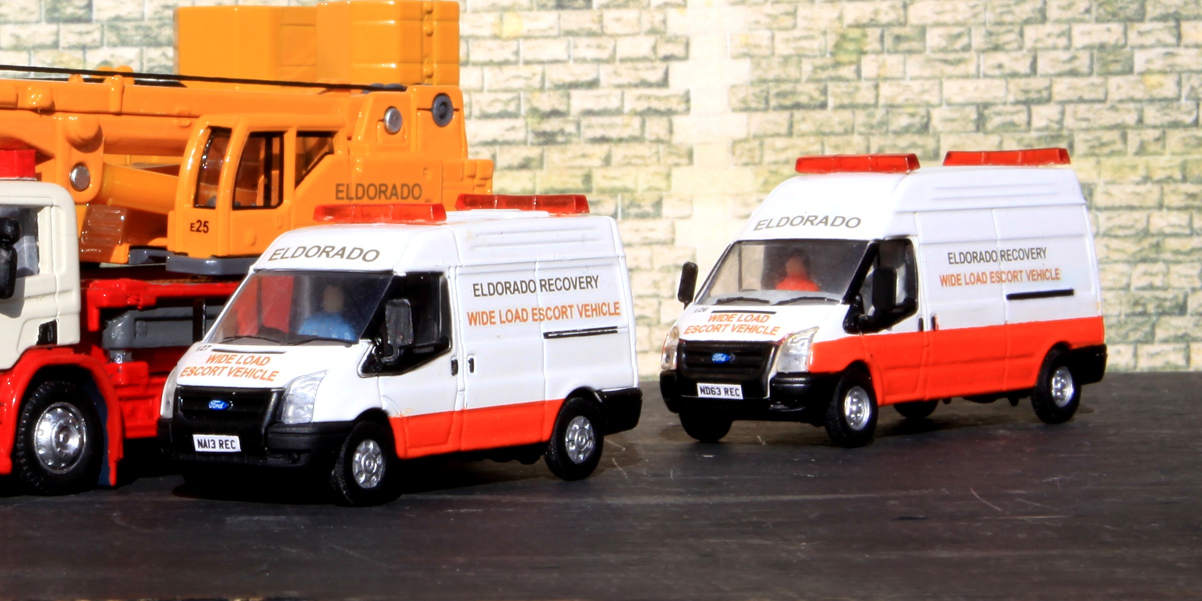 E26 (right) and E27 (left). Ford Transit vans, new in 2013, and acquired in 2019, long and short wheelbases respectively. These are Wide Load Escort Vehicles, and came with the two Liebherrs.